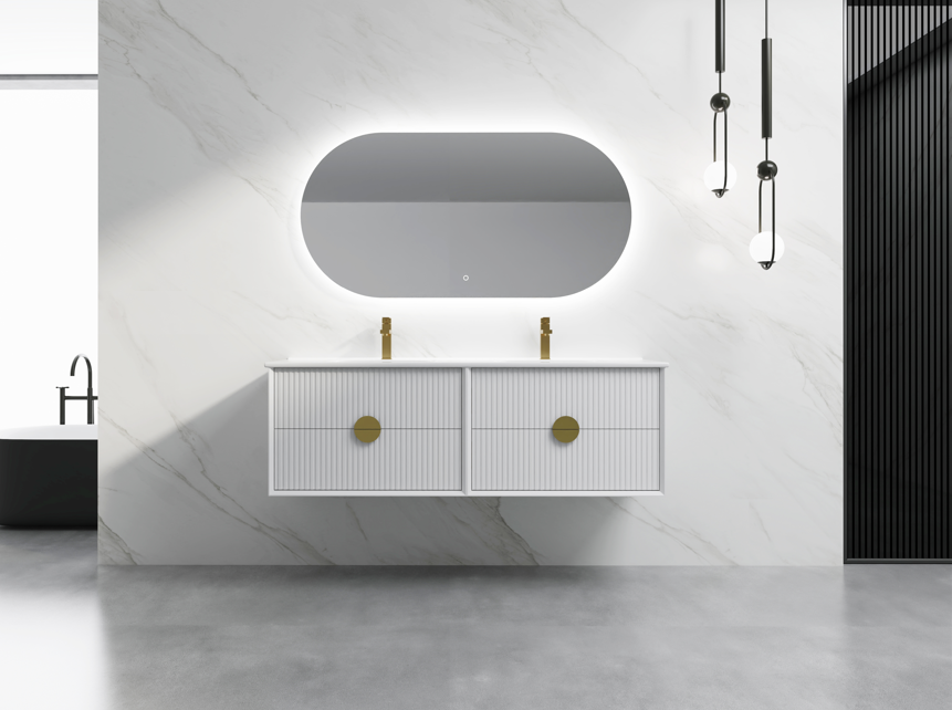 THIS UNIQUE WALL-HUNG VANITY IS A PIECE OF CONFIDENT BOLD DESIGN WHERE CLASSIC AND CONTEMPORARY ACCENTS GO PERFECT TOGETHER: WHITE BASIN AND COUNTERTOP COMBINE WITH CABINET GIVE YOU UNDERTONE BUT LUXURIOUS IN FIRST SIGHT. OF COURSE, HIGH-TECH CRAFTSMANSHIP AND HUMANIZED DESIGN ARE INDISPENSABLE.