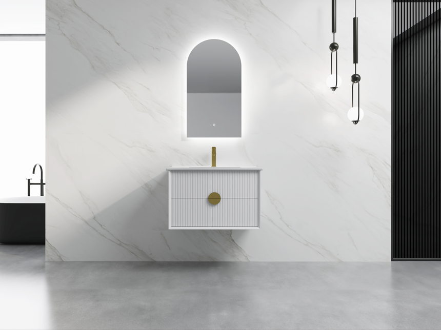 THIS UNIQUE WALL-HUNG VANITY IS A PIECE OF CONFIDENT BOLD DESIGN WHERE CLASSIC AND CONTEMPORARY ACCENTS GO PERFECT TOGETHER: WHITE BASIN AND COUNTERTOP COMBINE WITH CABINET GIVE YOU UNDERTONE BUT LUXURIOUS IN FIRST SIGHT. OF COURSE, HIGH-TECH CRAFTSMANSHIP AND HUMANIZED DESIGN ARE INDISPENSABLE.