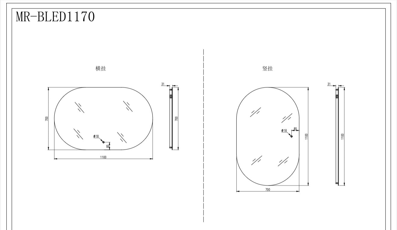 LED Mirror-BIANCA-CAPSULE 1100/1400mm with Demister Backlit Touch Switch 3 Colours Lighting Frameless